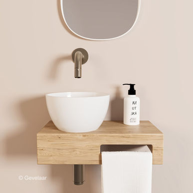 Dit samengestelde product heeft de plek van de glans witte waskom aan de linkerkant en de handdoekhouder rechts. Het afvoergat is voorgeboord, dus de waskom kan niet aan de andere kant gemonteerd worden. Van dit type is wel een gespiegelde variant leverbaar als je de waskom aan de andere kant wilt hebben.