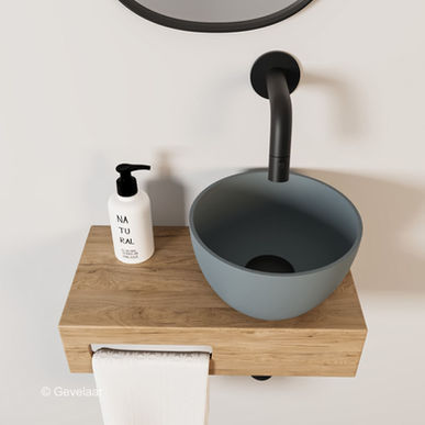 Dit samengestelde product heeft de plek van de mat grijs waskom aan de rechterkant en de handdoekhouder links. Het afvoergat is voorgeboord, dus de waskom kan niet aan de andere kant gemonteerd worden. Van dit type is wel een gespiegelde variant leverbaar als je de waskom aan de andere kant wilt hebben.