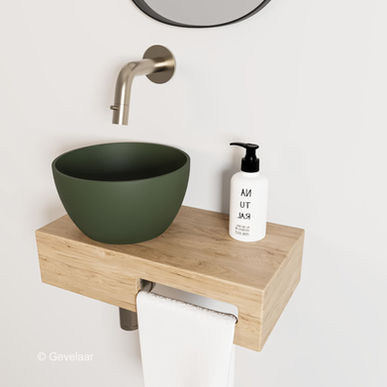 Arcqua Olivia fonteinset eikenhout waskom mat groen links inbouwkraan RVS