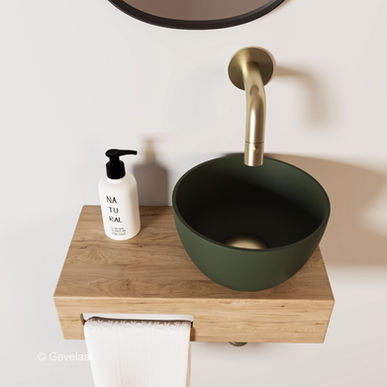 Arcqua Olivia fonteinset eikenhout waskom mat groen rechts kraan geb goud