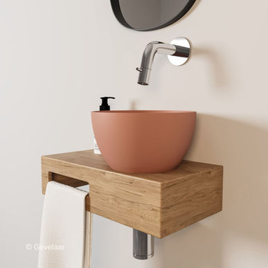 Arcqua Olivia fonteinset eikenhout waskom mat roze rechts inbouwkraan chroom