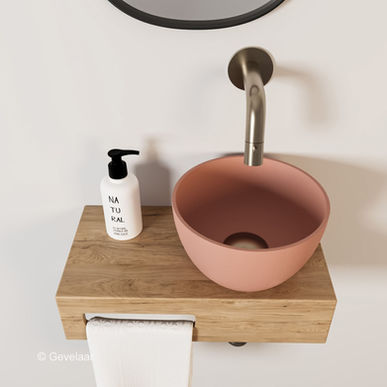 Arcqua Olivia fonteinset eikenhout waskom mat roze rechts inbouwkraan RVS