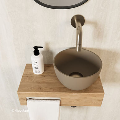 Arcqua Olivia fonteinset eikenhout waskom mat truffel rechts inbouwkraan RVS
