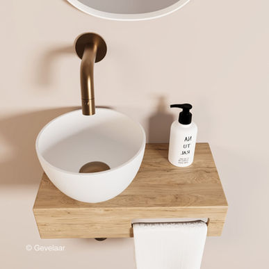 Arcqua Olivia fonteinset eikenhout waskom mat wit links inbouwkraan brons koper