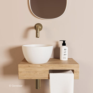 Arcqua Olivia fonteinset eikenhout waskom mat wit links inbouwkraan geb goud