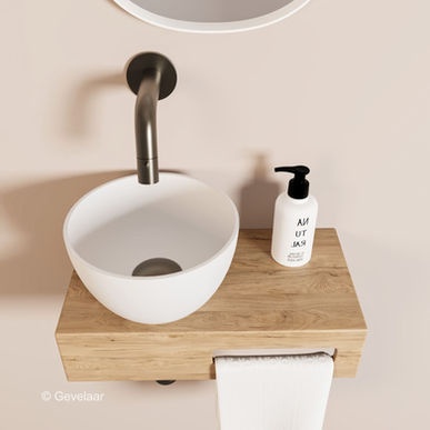 Dit samengestelde product heeft de plek van de mat witte waskom aan de linkerkant en de handdoekhouder rechts. Het afvoergat is voorgeboord, dus de waskom kan niet aan de andere kant gemonteerd worden. Van dit type is wel een gespiegelde variant leverbaar als je de waskom aan de andere kant wilt hebben.