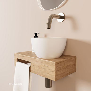 Dit samengestelde product heeft de plek van de mat witte waskom aan de rechterkant en de handdoekhouder links. Het afvoergat is voorgeboord, dus de waskom kan niet aan de andere kant gemonteerd worden. Van dit type is wel een gespiegelde variant leverbaar als je de waskom aan de andere kant wilt hebben.