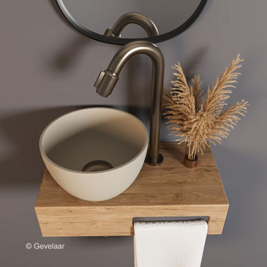 Arcqua Olivia fonteinset eikenhout waskom mat zand links kraan bo RVS