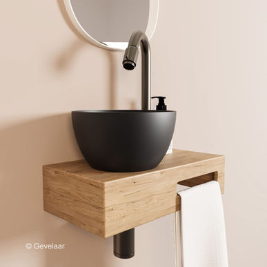 Dit samengestelde product heeft de plek van de mat zwarte waskom aan de linkerkant en de handdoekhouder rechts. Het afvoergat is voorgeboord, dus de waskom kan niet aan de andere kant gemonteerd worden. Van dit type is wel een gespiegelde variant leverbaar als je de waskom aan de andere kant wilt hebben.