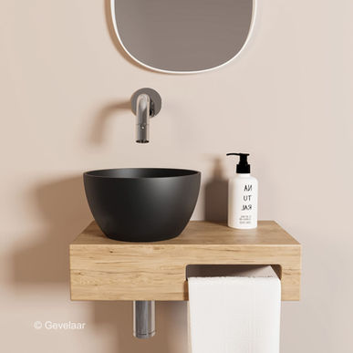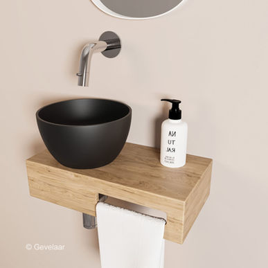Dit samengestelde product heeft de plek van de mat zwarte waskom aan de linkerkant en de handdoekhouder rechts. Het afvoergat is voorgeboord, dus de waskom kan niet aan de andere kant gemonteerd worden. Van dit type is wel een gespiegelde variant leverbaar als je de waskom aan de andere kant wilt hebben.