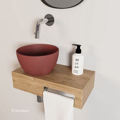 Dit samengestelde product heeft de plek van de mat terracotta waskom aan de linkerkant en de handdoekhouder rechts. Het afvoergat is voorgeboord, dus de waskom kan niet aan de andere kant gemonteerd worden. Van dit type is wel een gespiegelde variant leverbaar als je de waskom aan de andere kant wilt hebben.
