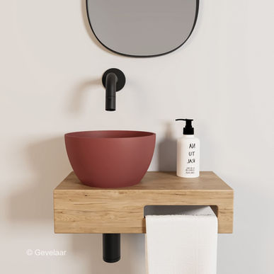 Dit samengestelde product heeft de plek van de mat terracotta waskom aan de linkerkant en de handdoekhouder rechts. Het afvoergat is voorgeboord, dus de waskom kan niet aan de andere kant gemonteerd worden. Van dit type is wel een gespiegelde variant leverbaar als je de waskom aan de andere kant wilt hebben.