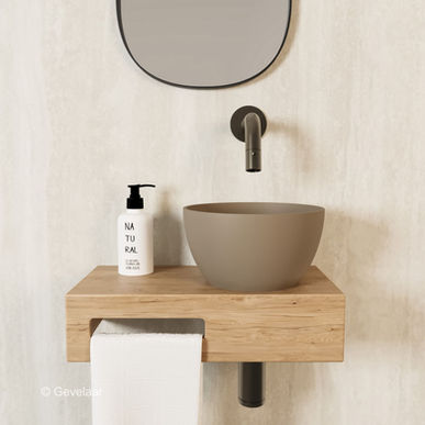 Arcqua Olivia fonteinset eikenhout waskom truffel rechts inbouwkraan gunmetal