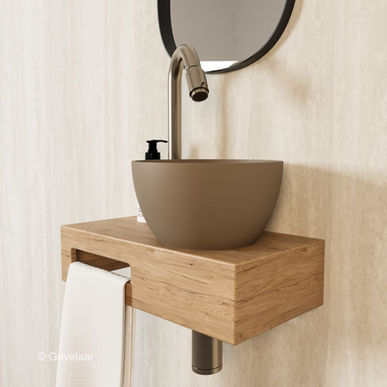 Dit samengestelde product heeft de plek van de mat truffel waskom aan de rechterkant en de handdoekhouder links. Het afvoergat is voorgeboord, dus de waskom kan niet aan de andere kant gemonteerd worden. Van dit type is wel een gespiegelde variant leverbaar als je de waskom aan de andere kant wilt hebben.