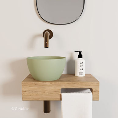 Dit samengestelde product heeft de plek van de mat pastel groen waskom aan de linkerkant en de handdoekhouder rechts. Het afvoergat is voorgeboord, dus de waskom kan niet aan de andere kant gemonteerd worden. Van dit type is wel een gespiegelde variant leverbaar als je de waskom aan de andere kant wilt hebben.