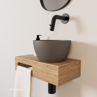 Arcqua Olivia fonteinset hout waskom quartz grijs rechts inb kraan mat zwart