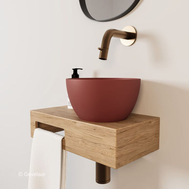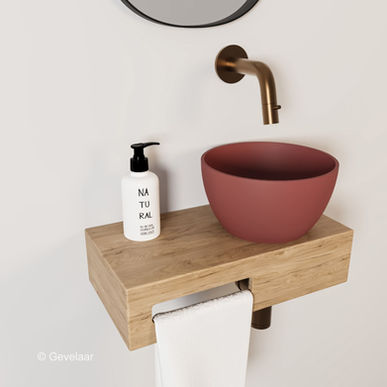 Dit samengestelde product heeft de plek van de mat terracotta waskom aan de rechterkant en de handdoekhouder links. Het afvoergat is voorgeboord, dus de waskom kan niet aan de andere kant gemonteerd worden. Van dit type is wel een gespiegelde variant leverbaar als je de waskom aan de andere kant wilt hebben.