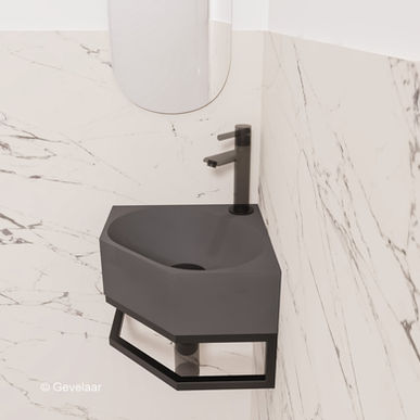 De set wordt geleverd metde wasbak en het mat zwarte frame die perfect zijn voor het creëren van een moderne look. De wasbak van hoogTRUEdig polystone is quartz beton en heeft een opvallende vorm, wat bijdraagt aan de algehele uitstraling van uw toiletruimte.