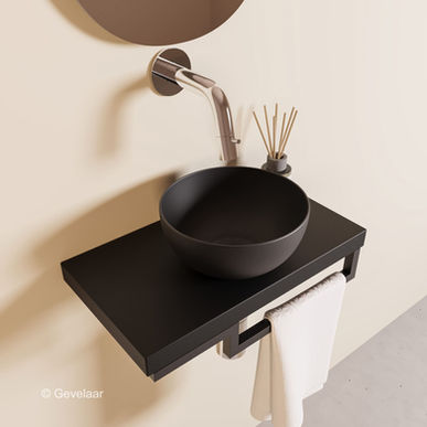 Het is mogelijk om deze fonteinset naar voorkeur te samenstellen. Hoe leuk is dat? Met de vele keuzeopties zoals de afwerking van de fonteinkraan, afvoerplug en sifon, beschikbaar in mat zwart, chroom, geborsteld goud, geborsteld koper of RVS. Maar ook bijvoorbeeld de kleur van de handdoekhouder, in alle kleuren.
