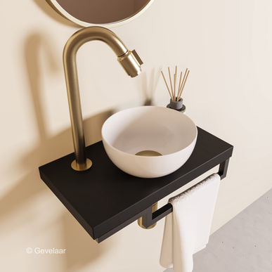 Proline TOP mat zwart fonteinset kraan bo geb goud kom 20cm glans wit houder R