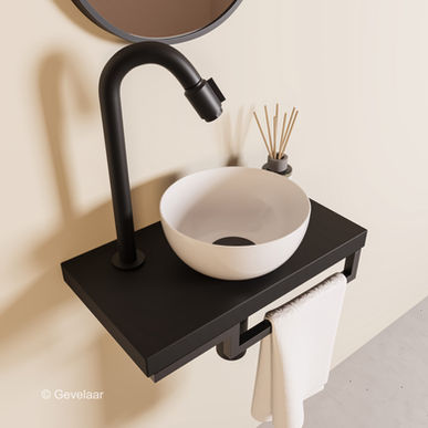Proline TOP mat zwart fonteinset kraan bo mat zwart kom 20cm glans wit houder R