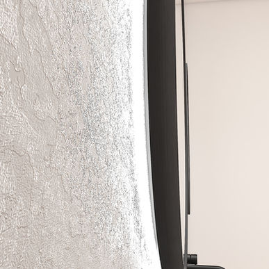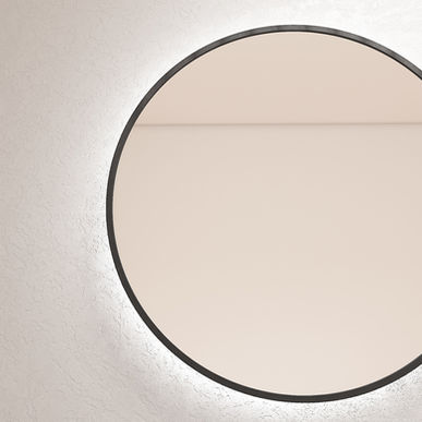 Ronde spiegel met zwarte rand en indirecte ledverlichting. De verlichting komt achter de spiegel weg en geeft zodoende een gaaf effect over de muur.