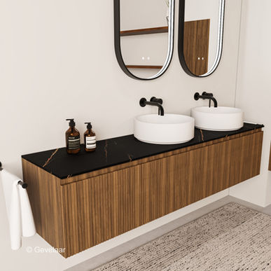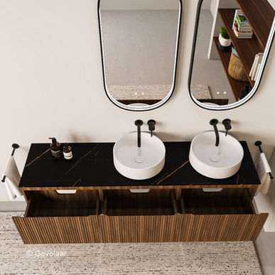 Striato ribbel noten badmeubel 180cm - 3 laden 60cm-afdekblad marmer zwart