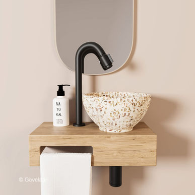 Tanaro Arche fonteinset eikenhout kraan mat zwart waskom terrazzo beige rechts