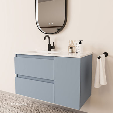 - Vlakke front mist blauw badkamermeubel 90 cm. met 1 lade van 60 cm. en 1 deur van 30 cm.