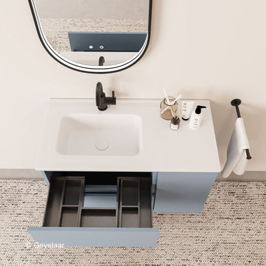 - Vlakke front mist blauw badkamermeubel 90 cm. met 1 lade van 60 cm. en 1 deur van 30 cm.