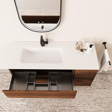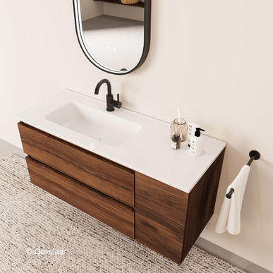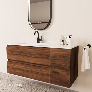 - Vlakke front noten badkamermeubel 120 cm. met 1 lade van 90 cm. en 1 deur van 30 cm.