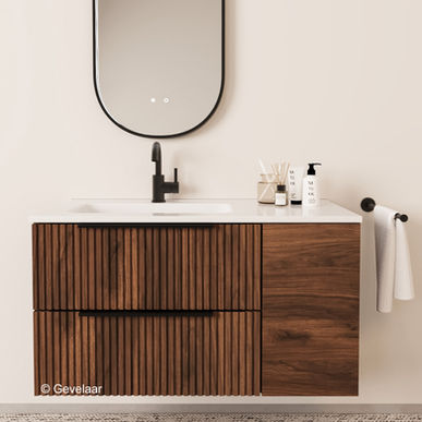 Tip: De Cliff Rib ribbelfront noten badkamermeubel 100 cm. combineert erg goed met onze wastafelkranen, sifons en wastes. Sluit je opbouw wastafelkranen aan met onze hoekstopkranen. Ook is er een bijpassende ribbelfront noten hoge kast.