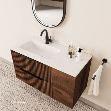 - Ribbelfront noten badkamermeubel 100 cm. met 1 lade van 70 cm. en 1 deur van 30 cm.