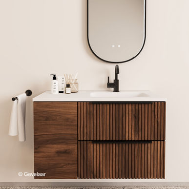 Tip: De Cliff Rib ribbelfront noten badkamermeubel 90 cm. combineert erg goed met onze wastafelkranen, sifons en wastes. Sluit je opbouw wastafelkranen aan met onze hoekstopkranen. Ook is er een bijpassende ribbelfront noten hoge kast.