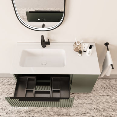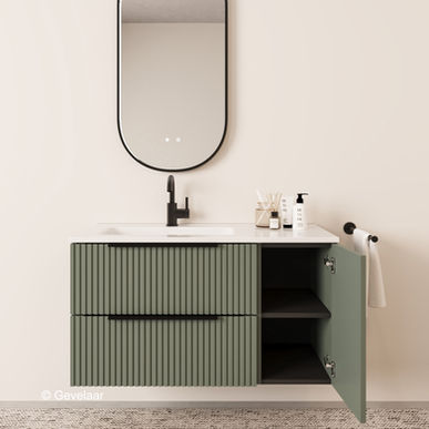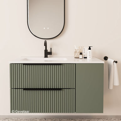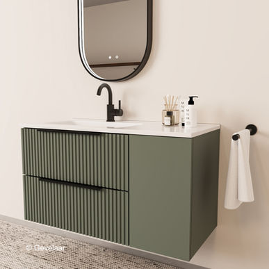 Tip: De Cliff Rib ribbelfront olijf groen badkamermeubel 100 cm. combineert erg goed met onze wastafelkranen, sifons en wastes. Sluit je opbouw wastafelkranen aan met onze hoekstopkranen. Ook is er een bijpassende ribbelfront olijf groen hoge kast.
