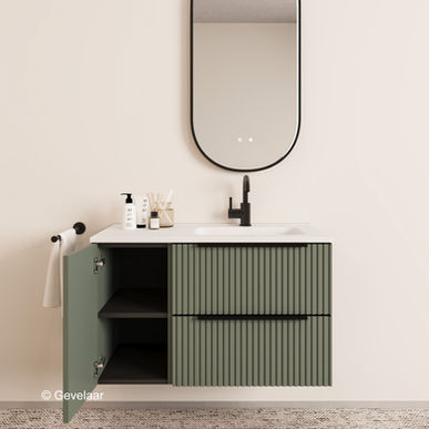 Tip: De Cliff Rib ribbelfront olijf groen badkamermeubel 90 cm. combineert erg goed met onze wastafelkranen, sifons en wastes. Sluit je opbouw wastafelkranen aan met onze hoekstopkranen. Ook is er een bijpassende ribbelfront olijf groen hoge kast.