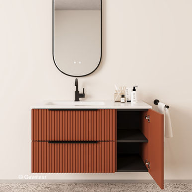 Een compleet Cliff Rib ribbelfront terracotta badkamermeubel 100cm - wastafel glans wit links bevat de volgende onderdelen. ↓