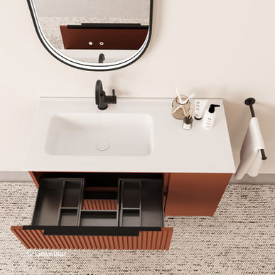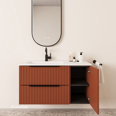 Tip: De Cliff Rib ribbelfront terracotta badkamermeubel 100 cm. combineert erg goed met onze wastafelkranen, sifons en wastes. Sluit je opbouw wastafelkranen aan met onze hoekstopkranen. Ook is er een bijpassende ribbelfront terracotta hoge kast.