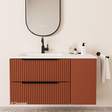 Een compleet Cliff Rib ribbelfront terracotta badkamermeubel 100cm - wastafel mat wit links bevat de volgende onderdelen. ↓