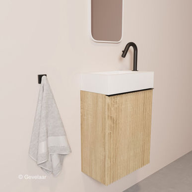 Dit samengestelde product kan zowel de plek van de fonteinkraan aan de linker en rechterkant hebben, dit kan je zelf bepalen. Prettig aan de kast is dat deze een softclose functie heeft. Het greepje zit aan de achterkant vast geschroefd in de deur. Dat vinden wij heel erg mooi, maar wil je dat greepje nu niet? Dan is het greepje dus eenvoudig te verwijderen. De kast in het eiken is omkeerbaar, en kan zowel links als rechts scharnierend worden gemonteerd.