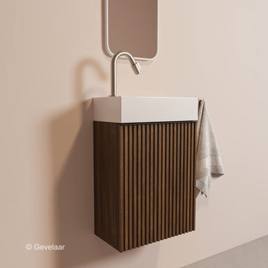 Het is mogelijk om deze fonteinset naar voorkeur te samenstellen. Hoe leuk is dat? Met de vele keuzeopties zoals de afwerking van de fonteinkraan, afvoerplug en sifon, beschikbaar in mat zwart, chroom, geborsteld goud, geborsteld koper of RVS. Maar ook bijvoorbeeld de kleur van het kastje, bijvoorbeeld in het zwart of noten.
