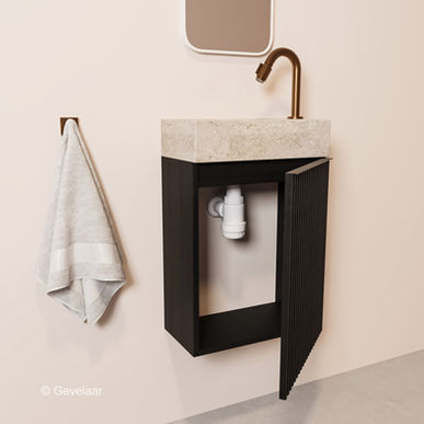 Tanaro FreshDream fonteinset kast zwart hout wasbak travertin rechts brons koper