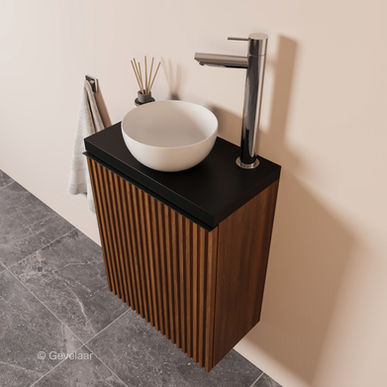De positie van de waskom en fonteinkraan kun je zelf bepalen. Het gat hiervoor dient door jezelf of de installateur geboord te worden. De fonteinkraan (Ø 28 mm), en waskom (Ø 65 mm). Dat gaat heel gemakkelijk met een houtboortje.