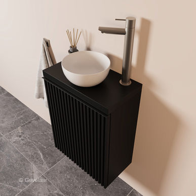 De positie van de waskom en fonteinkraan kun je zelf bepalen. Het gat hiervoor dient door jezelf of de installateur geboord te worden. De fonteinkraan (Ø 28 mm), en waskom (Ø 65 mm). Dat gaat heel gemakkelijk met een houtboortje.