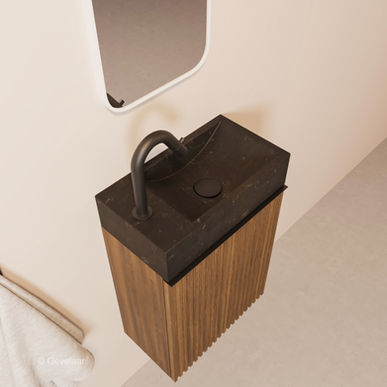 Tanaro freshstone fonteinset noten kast wasbak links hardsteen kraan mat zwart