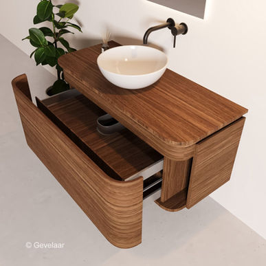- Afgeronde vlakke front noten badkamermeubel 120 cm. 2 lade (waarvan 1 binnenlade)