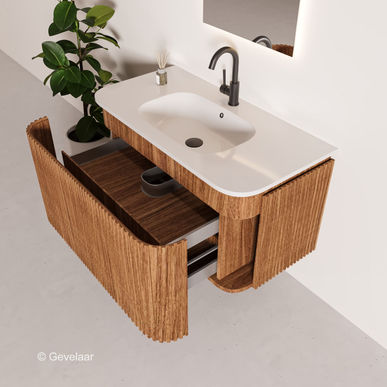 - Afgeronde ribbelfront noten badkamermeubel 100 cm. 2 lade (waarvan 1 binnenlade)