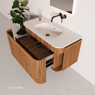- Afgeronde ribbelfront noten badkamermeubel 100 cm. 2 lade (waarvan 1 binnenlade)
