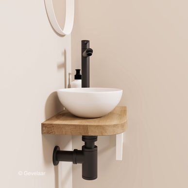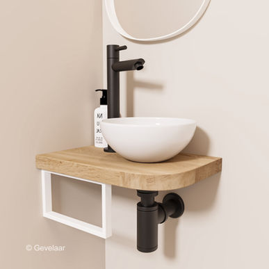 Deze fonteinset past perfect in een toiletruimte met een minimale afmeting van 80x110 cm. Grotere ruimtes kunnen uiteraard ook. Door zijn afmetingen van 35x23 cm en de afgeronde hoek is deze fonteinset erg praktisch. Daarnaast past hij in vrijwel elk toilet, doordat hij zowel links als rechts geplaatst kan worden. Het planchet draai je eenvoudig om, want het is aan beide zijden netjes afgewerkt. De plank heeft een voorgeboord gat met een doorsnee van 70 mm.