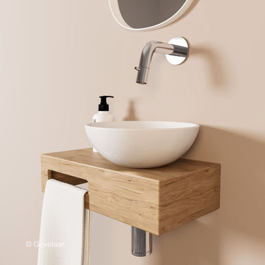 Dit samengestelde product heeft de plek van de glans witte waskom aan de rechter kant en de handdoekhouder links. Het afvoergat is voorgeboord, dus de waskom kan niet aan de andere kant gemonteerd worden. Van dit type is wel een gespiegelde variant leverbaar als je de waskom aan de andere kant wilt hebben.